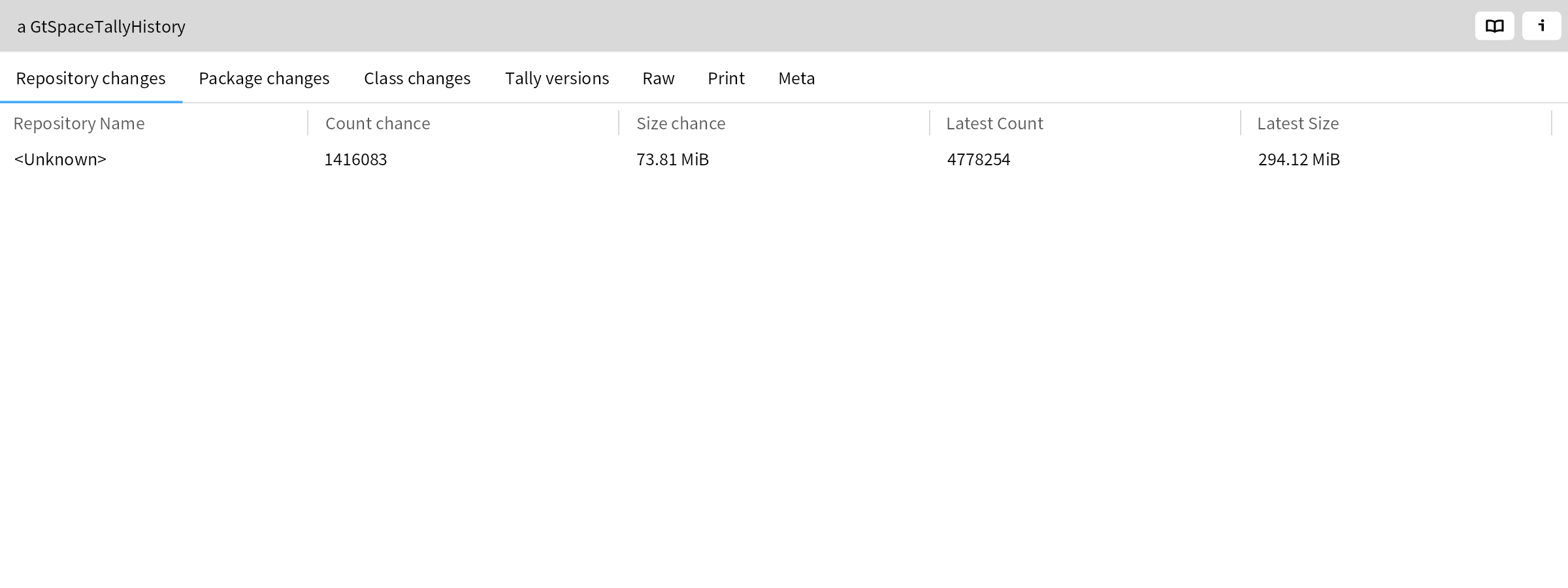 The system maintains a default history, and it adds several tallies to it during the creation of the Glamorous Toolkit image. Below is the list of versions curently recorded.