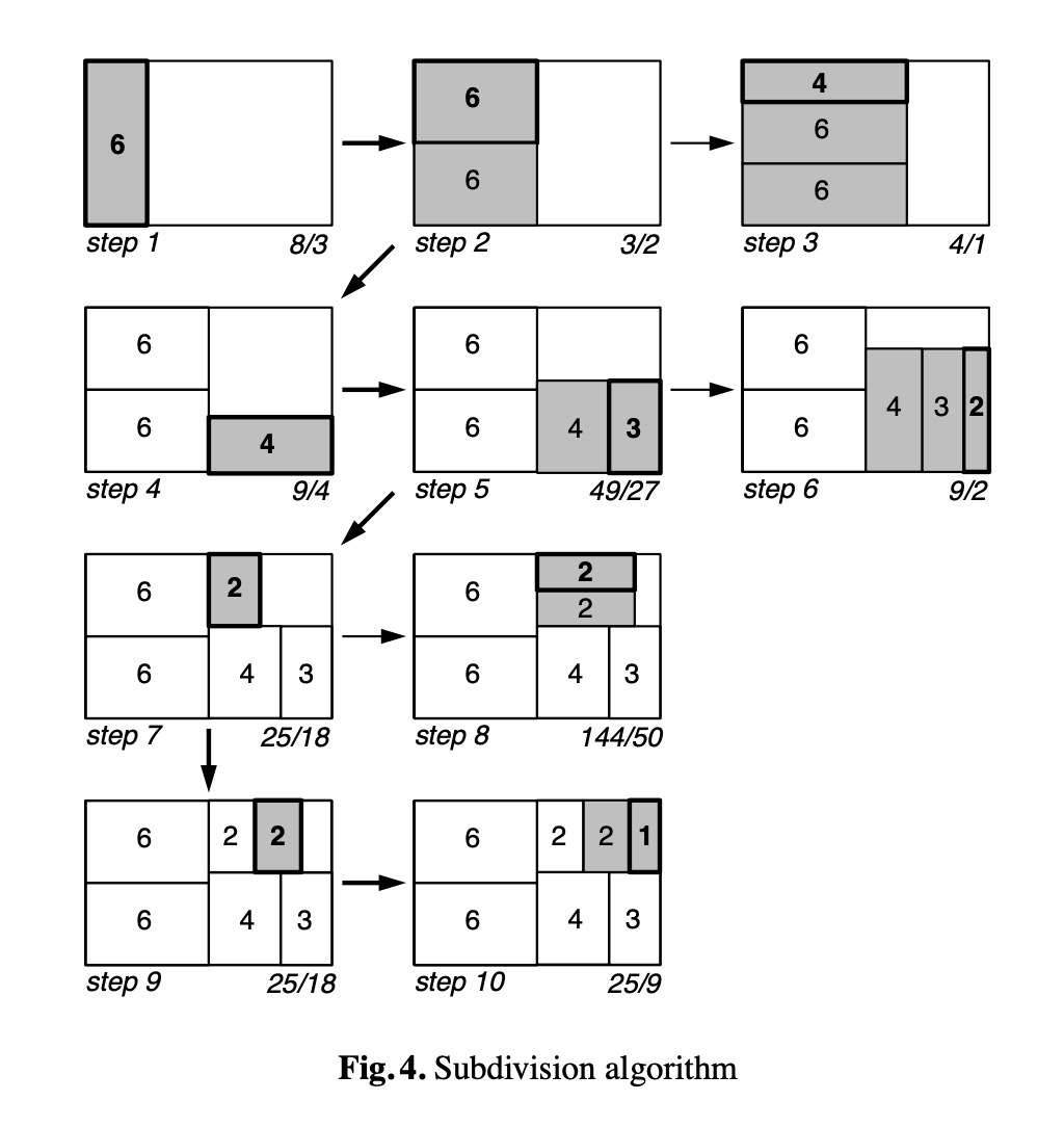 The example in the picture is about laying out nodes with the following weights #(6 6 4 3 2 2 1). The whole idea of the algorithm is to choose subdivisions that preserve the desired ratio. The diagram shows both the accepted and the rejected choices.