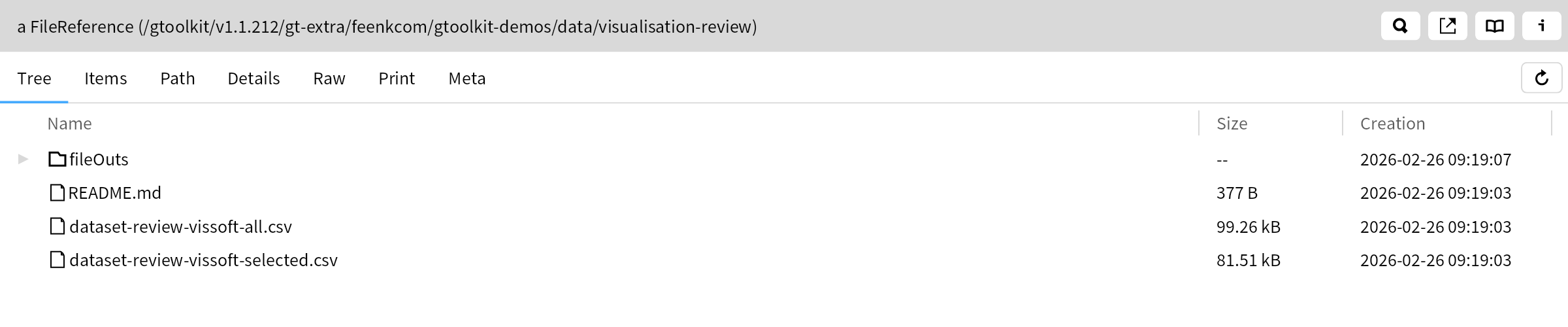 What we see here is an object inspector on the folder containing the dataset. You might not recognize it as such because an inspector usually just shows a generic, “raw” view of an object within a debugger. In this case the inspector has been molded to show a more useful Tree view of the contents of the folder. ⇒ Click on the Raw view and compare it with the Tree view. ⇒ Return to the Tree view and click on the .csv files to inspect them.