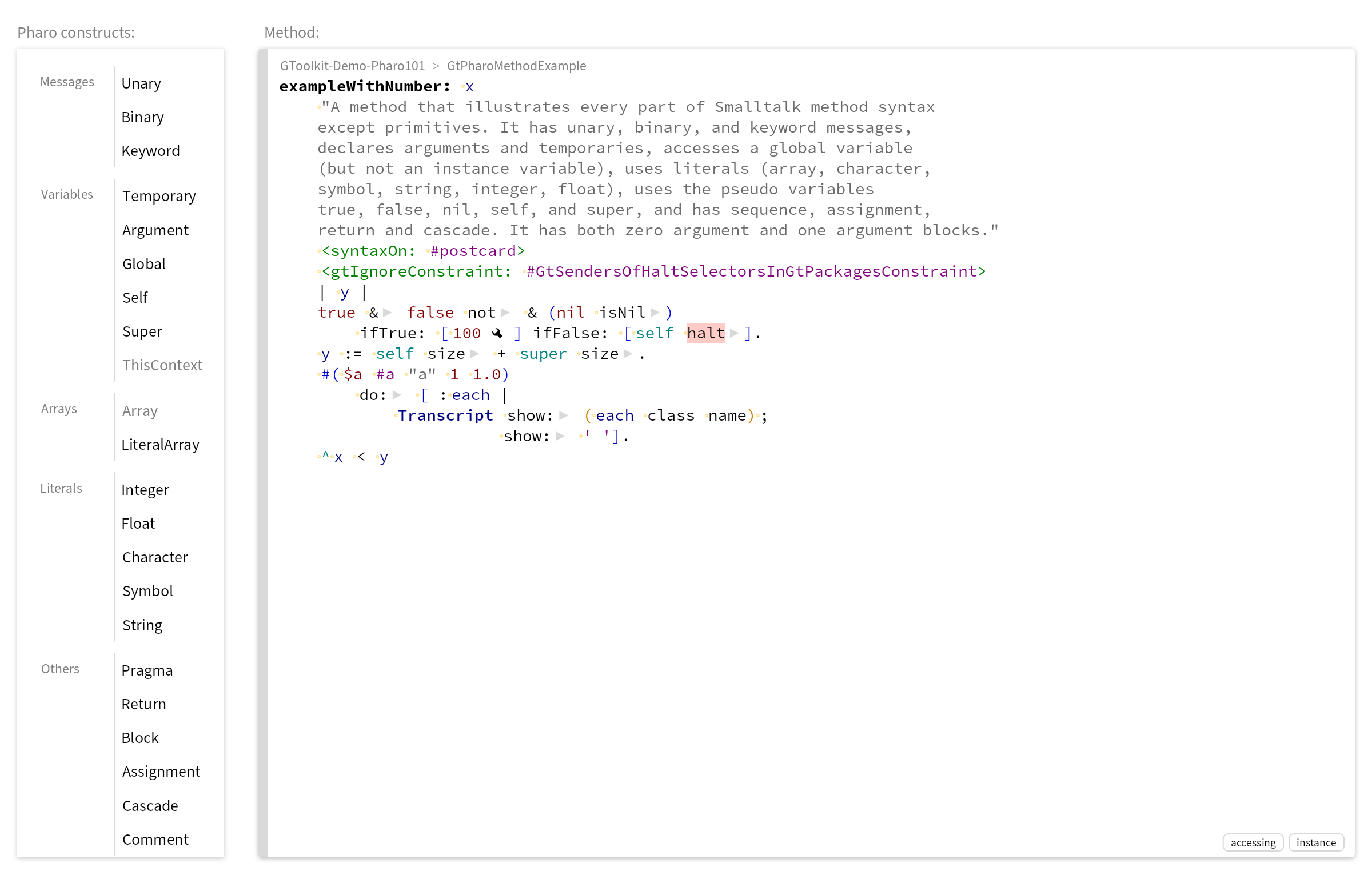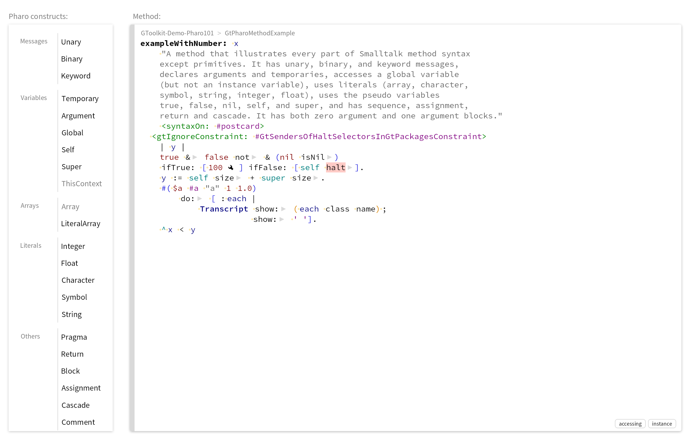 The example below is a completely artificial method that does not perform any useful work, but it illustrates all the important elements of Smalltalk method syntax. Simply hover with the mouse over any of the Pharo constructs listed at the left (such as Unary), and all the corresponding syntactic elements in the example will be highlighted.